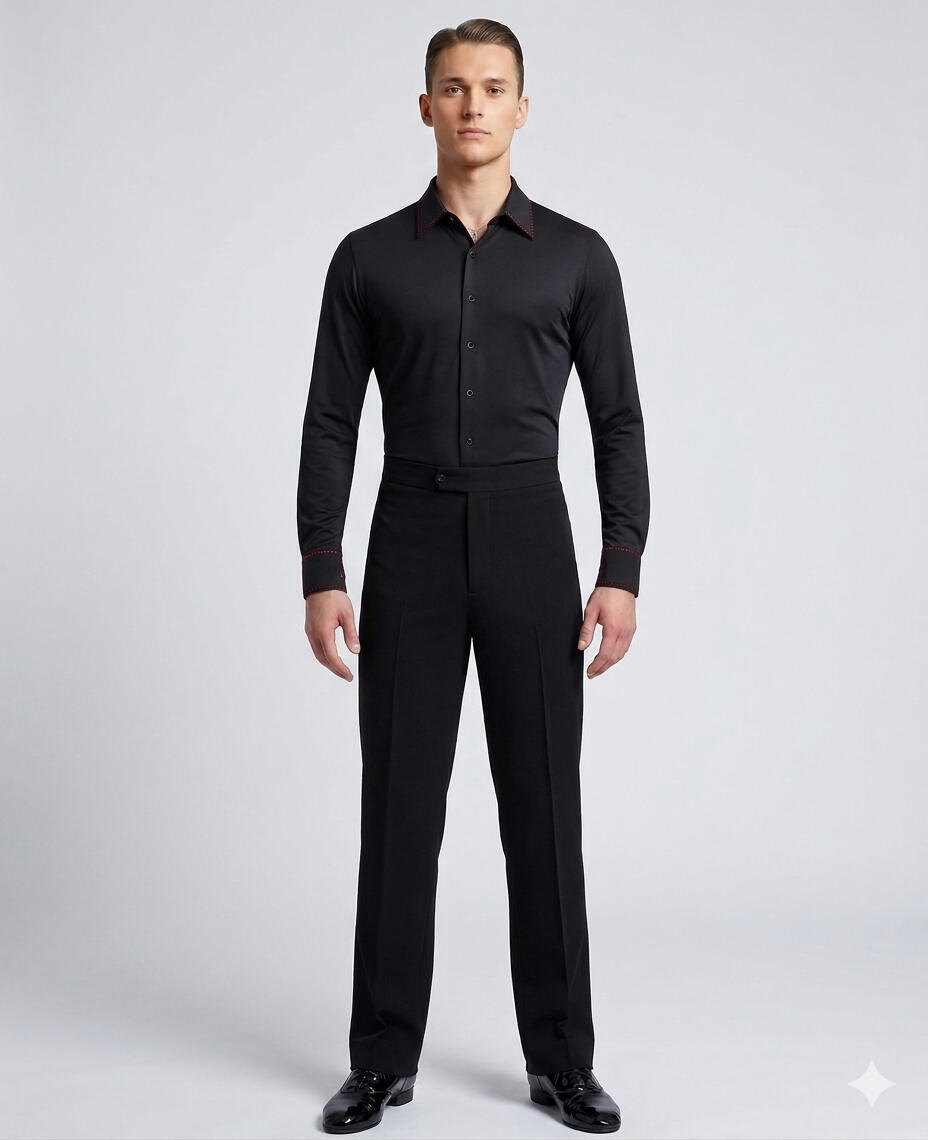 MEN'S DANCE SHIRT MADE OF VISCOSE. PERFECT FOR ANY OCCASION, WITH DETAILS IN THE RED STITCHING OF THE COLLAR AND CUFFS, WITH A RED RHINESTONE DETAIL ON THE FIRST BUTTON.REGULAR FIT, MADE OF LIGHTWEIGHT VISCOSE, EXCELLENT FOR DANCE.COOL FABRIC, PARTICULARLY SUITABLE FOR DANCE.