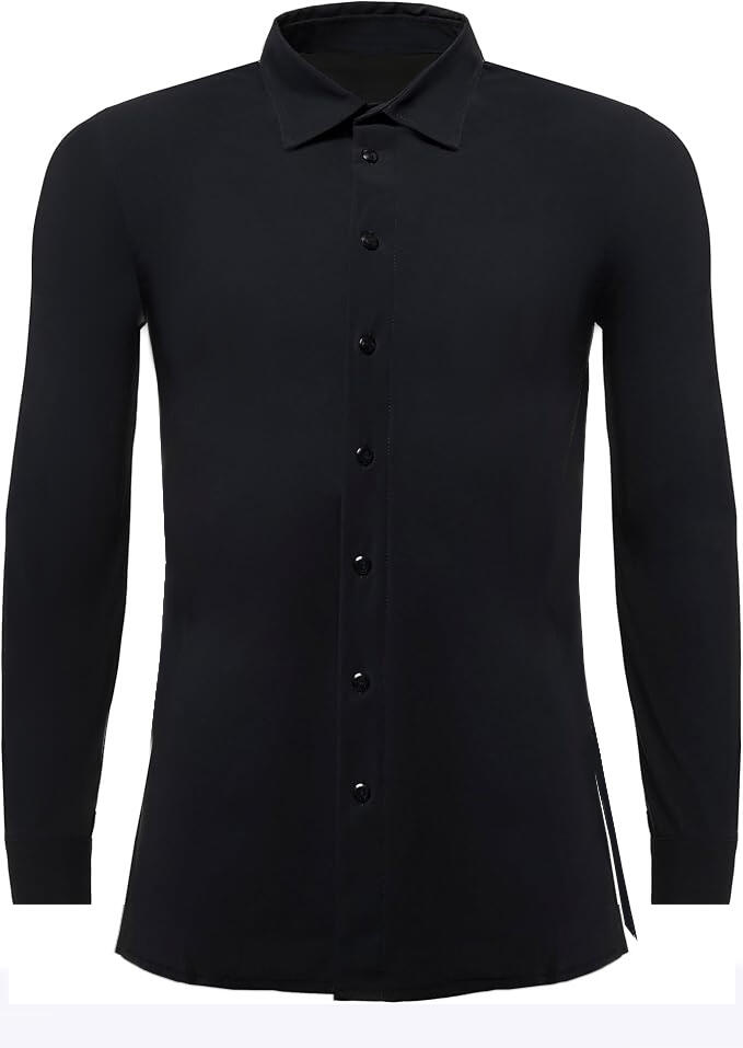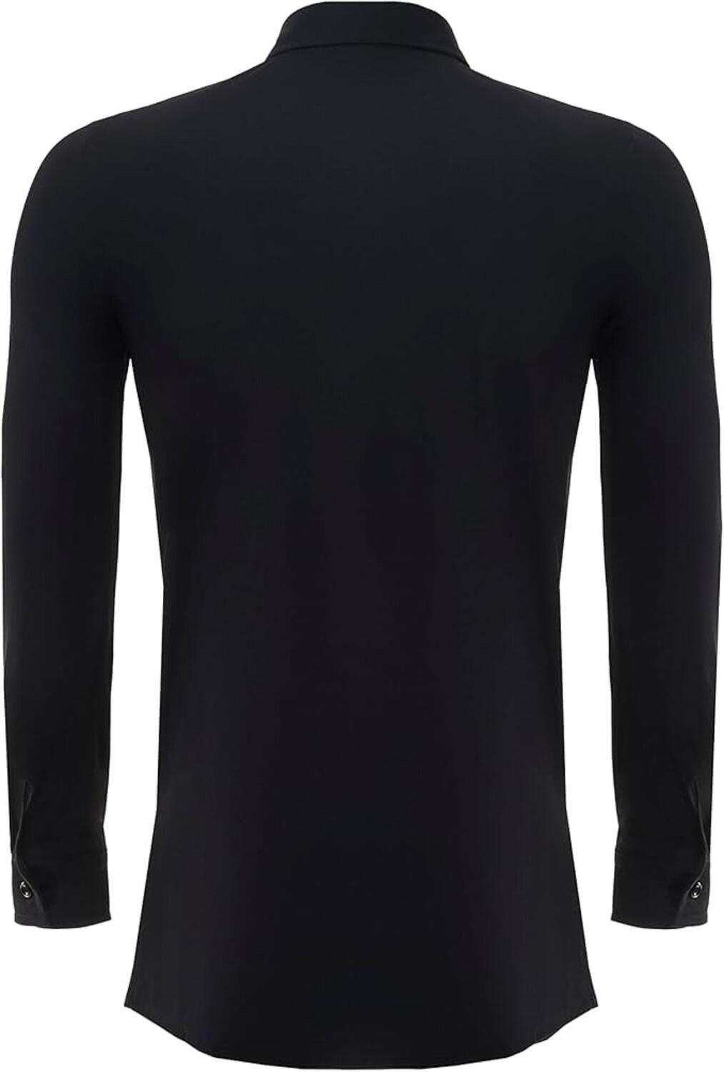 MEN'S DANCE SHIRT IN A REGULAR FIT, NEITHER TIGHT NOR LOOSE, VERY ELASTIC AT THE BACK AND ARMS, WHILE MORE STRUCTURED AT THE FRONT IN THE CUFFS AND COLLAR.DETAILS AT THE SIDE ENDINGS MAKE IT AN ORIGINAL T-SHIRT STYLE GIVEN THAT IT IS STRAIGHT CUT WITHOUT THE ROUNDED ENDINGS TYPICAL OF REGULAR SHIRTS.VERY ELEGANT AND REFINED, MADE WITH A HIGH-QUALITY, SLIGHTLY SHINY STRETCH TECHNICAL FABRIC ON THE FRONT. PERFECT FOR ANY OCCASION AND ALSO FOR WEARING ON ITS OWN OUTSIDE OF TROUSERS WITH A VEST.MADE WITH STRETCH FABRIC.