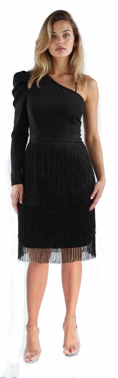 SINGLE SLEEVE DESIGN, WITH A PARTICULAR SOFT PUFF ABOVE THE RIGHT SHOULDER SIDE ZIPPER FOR BETTER WEARING AND 3 ROWS OF FRINGES AT THE BOTTOM PART OF THE DRESS LINED WITH ELASTIC JERSEY TO GIVE THE RIGHT ELASTICITY AND FREEDOM OF MOVEMENT DURING THE DANCE, READCUPS INSERT INSIDE THE BODICE.