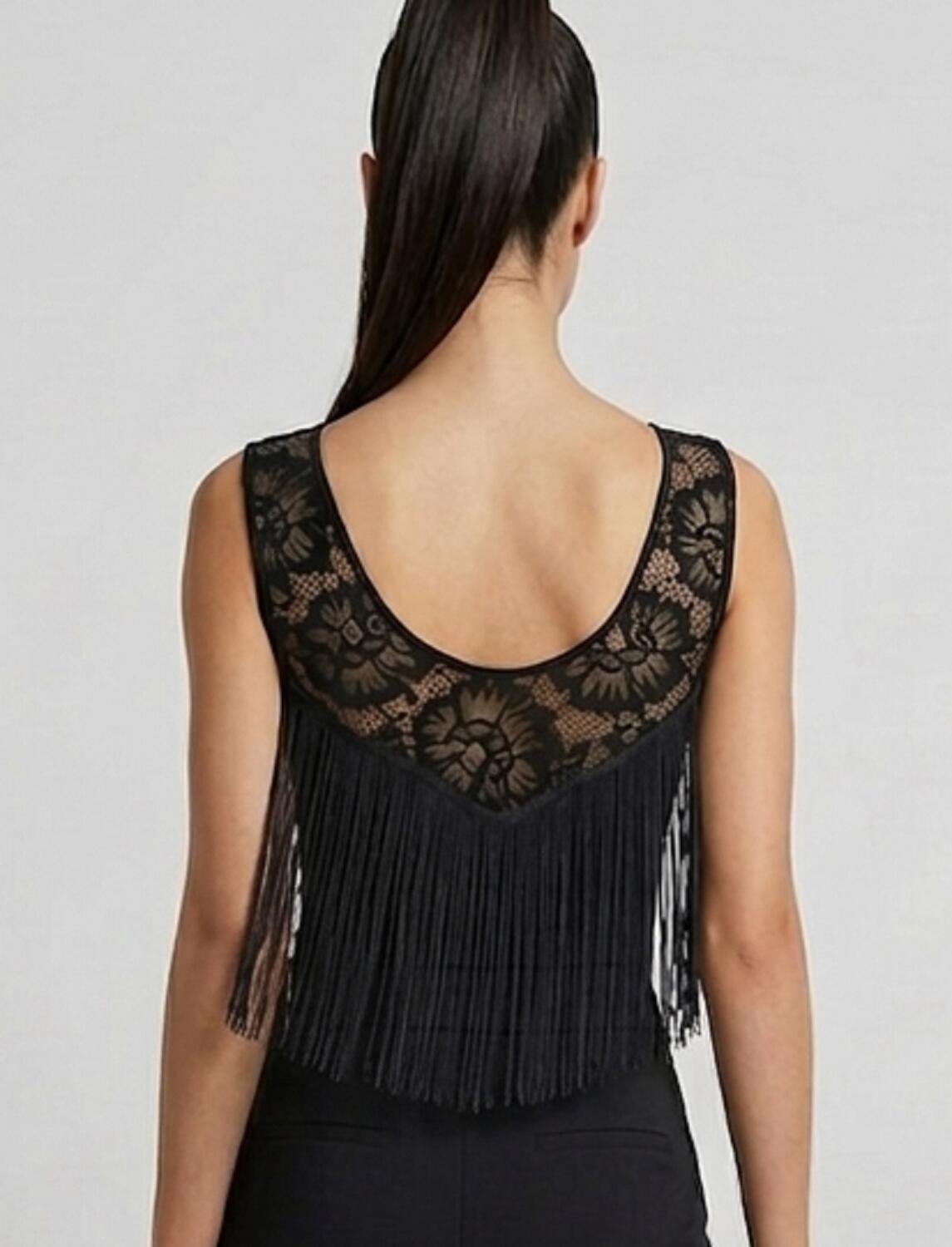 Stretchy dance top with a stretch lace neckline and fringes on the front and back, attached to the lace trim. The front features an internal triangle at the neckline to prevent it from being see-through.The back is slightly exposed at the top.Fitted, yet still very stretchy.Color: Black, including lace and fringe.