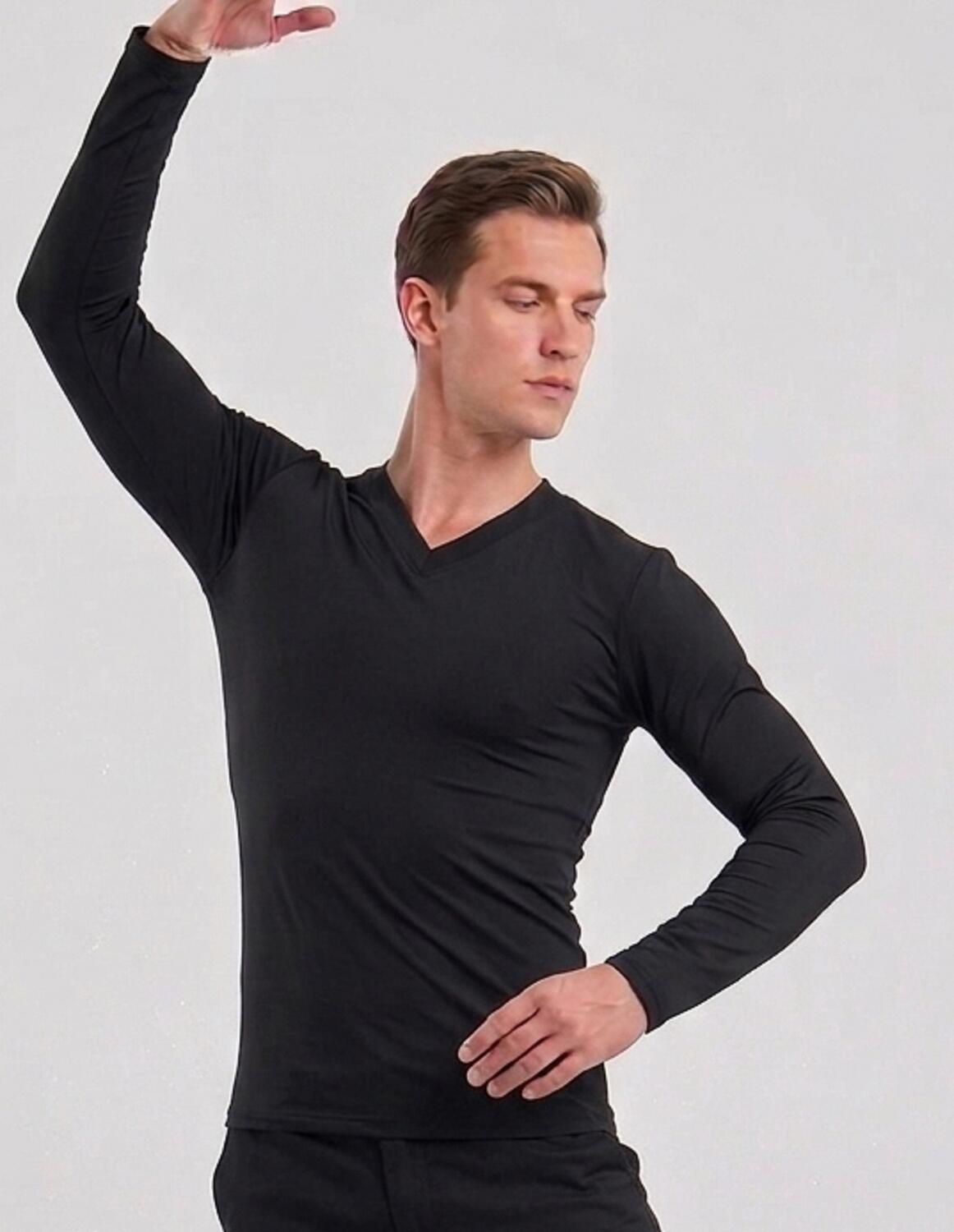 SIMPLE BUT ELEGANT DANCE JERSEY FOR MEN WITH LONG SLEEVES IN FINE BLACK ELASTIC TECHNICAL JERSEY WITH BORDINATED "V" NECK, IDEAL FOR ALL KINDS OF DANCE AND EVEN FOR TRAINING. LIGHTWEIGHT AND VERY ELASTIC FABRIC.