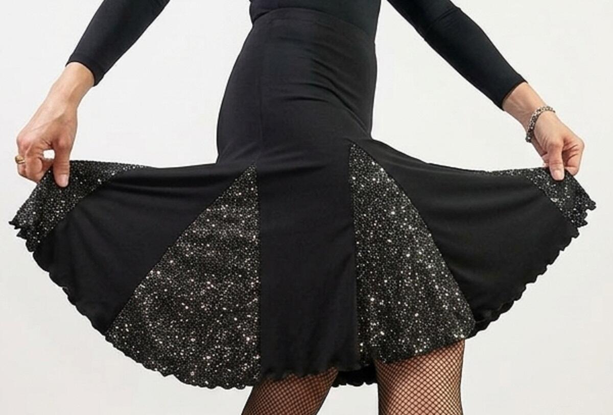 TAILORED SKIRT MADE EXCLUSIVELY FOR OUR BRAND IN BEAUTIFUL BLACK JERSEY bielastica, SEGMENTS WITH INSERT IN HIGH QUALITY FABRIC BRILLANTINATO ARGENTATA.ELASTICO 3 cm. IN LIFE. SKIRT LENGTH ABOUT 45 cm.