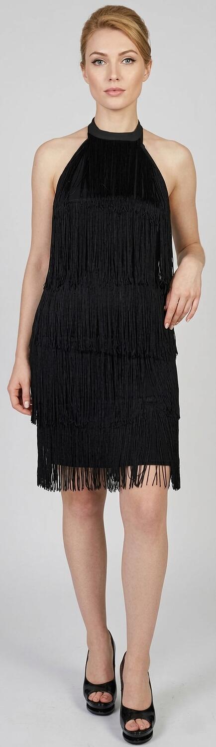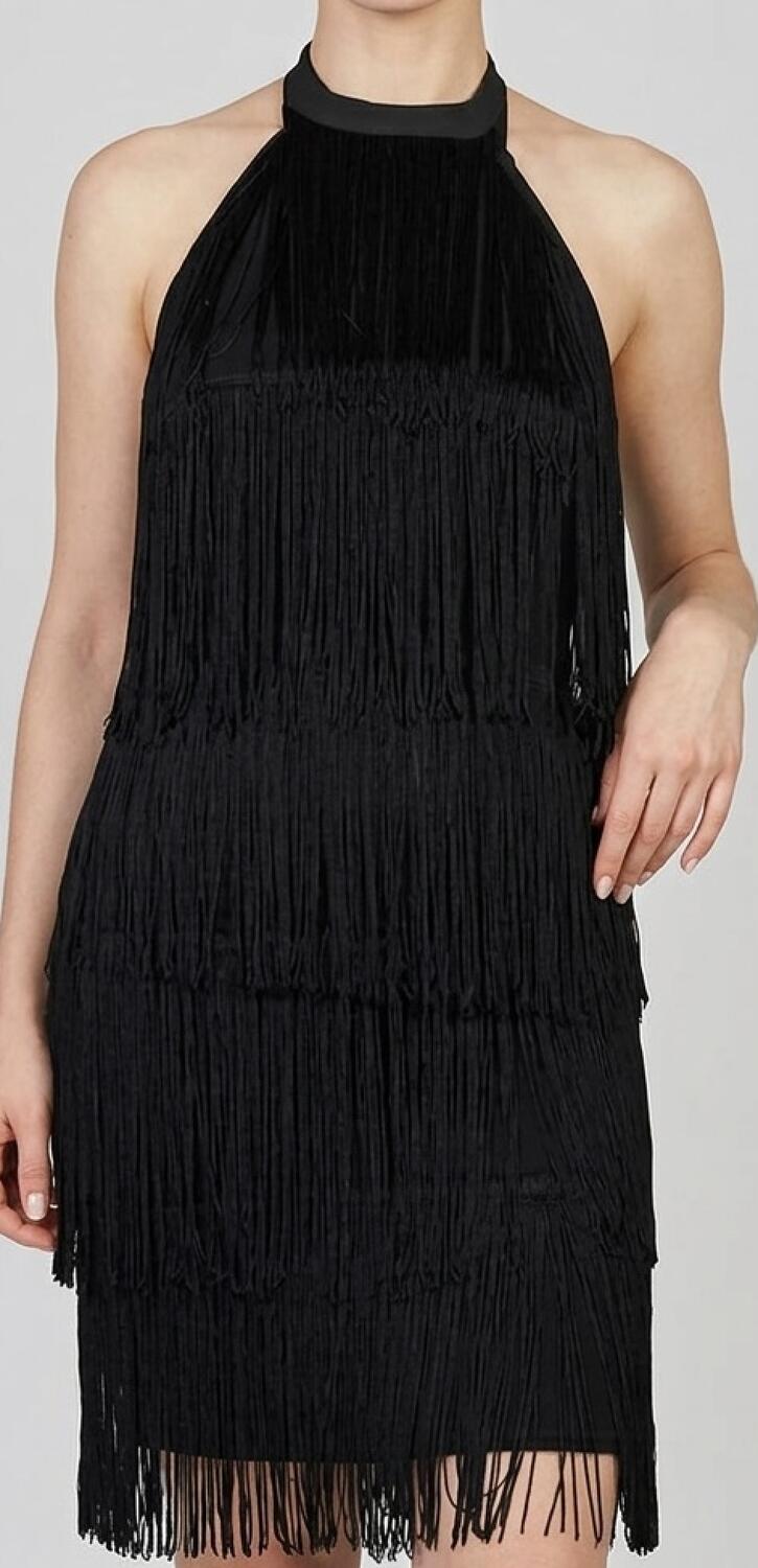 CHARLESTON DRESS WITH TURTLENECK COLLAR AND MEDIUM NECKLINE IN THE BACK, FIT GUARANTEED THANKS TO THE EXCELLENT ELASTICITY OF THE FABRIC AND FRINGES MOUNTED ON AN ELASTIC BASE, CREW NECK LACED BEHIND.