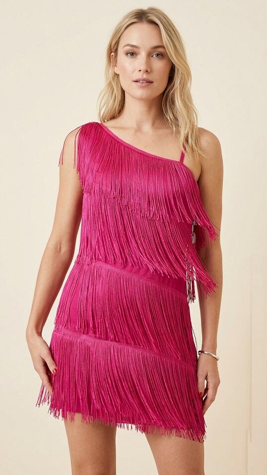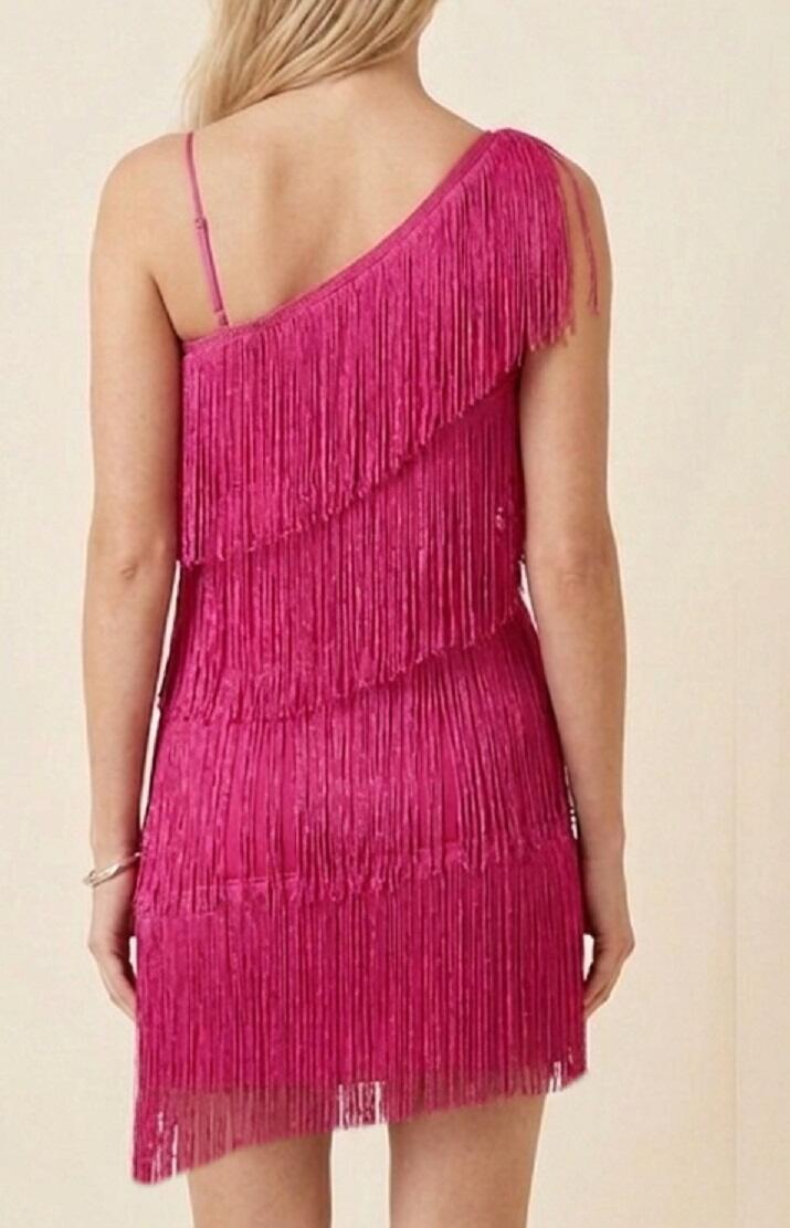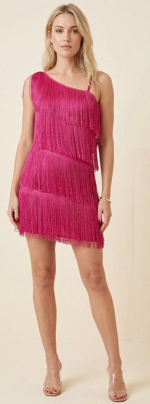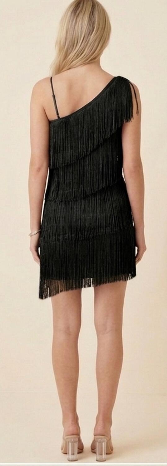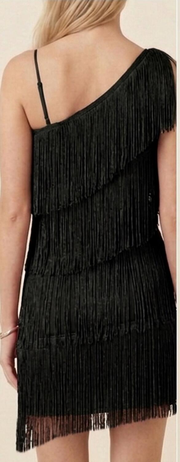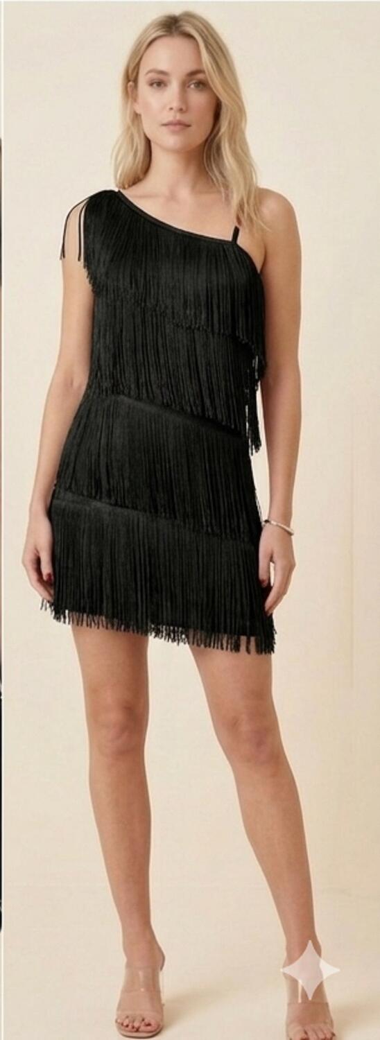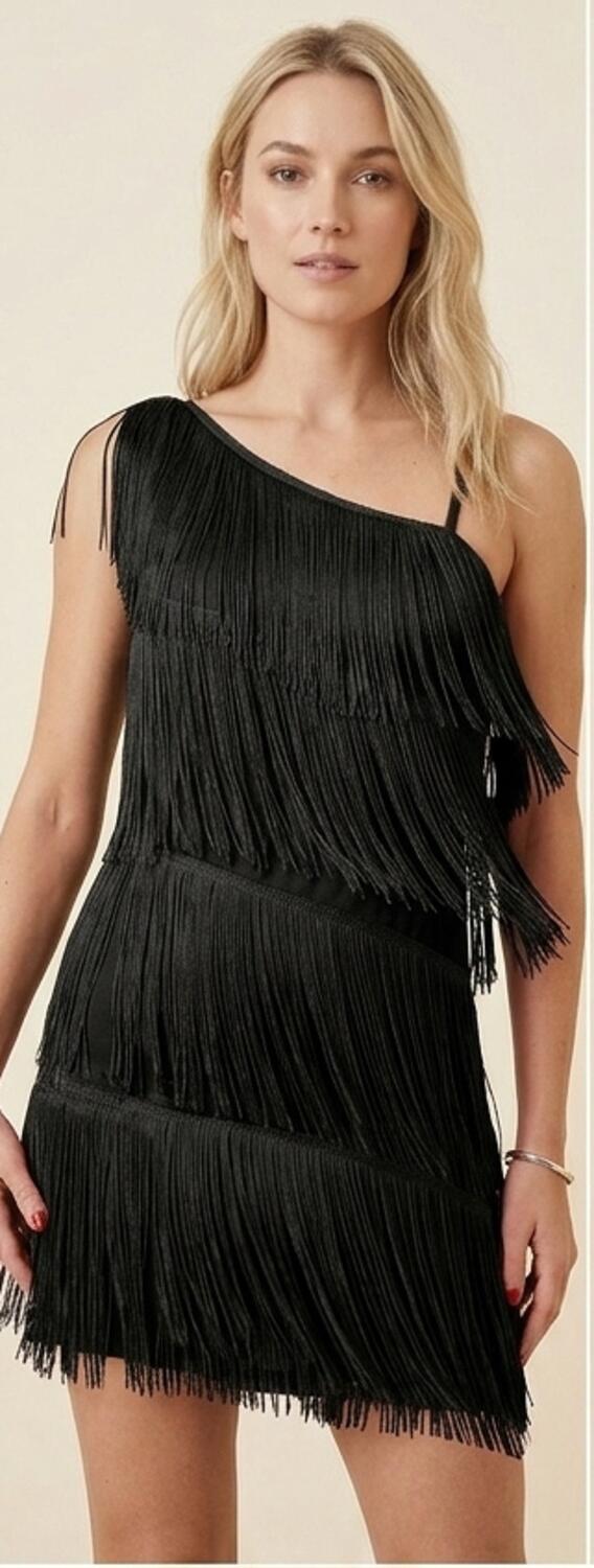 CHARLESTON DRESS WITH SHORT FRINGES ON ONE SIDE AND LONGER ON THE OTHER HALF THIGH ONE WIDE AND ONE FINE SHOULDER GOOD FIT BECAUSE VERY ELASTIC
