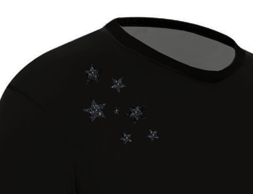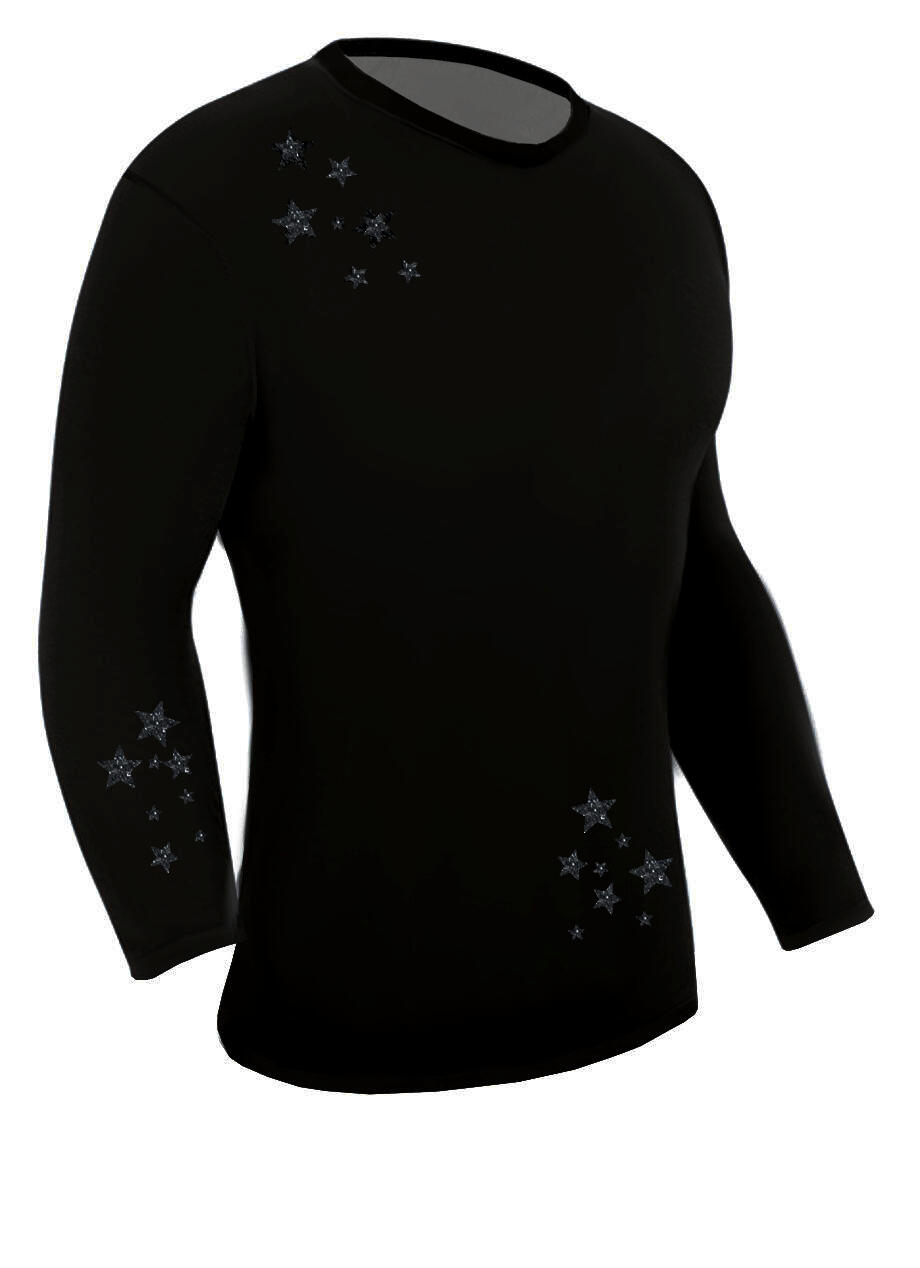 MEN'S DANCE SHIRT WITH A SILVER GLITTER PRINT IN THE SHAPE OF STARS OF VARIOUS SIZES IN 3 AREAS OF THE SHIRT, AS SHOWN IN THE PHOTO. LONG SLEEVES IN FINE BLACK STRETCH TECHNICAL JERSEY WITH A ROUND NECK, IDEAL FOR ALL TYPES OF DANCE AND EVEN FOR TRAINING. LIGHTWEIGHT AND VERY STRETCH FABRIC.FITTED BUT STRETCHABLE.
