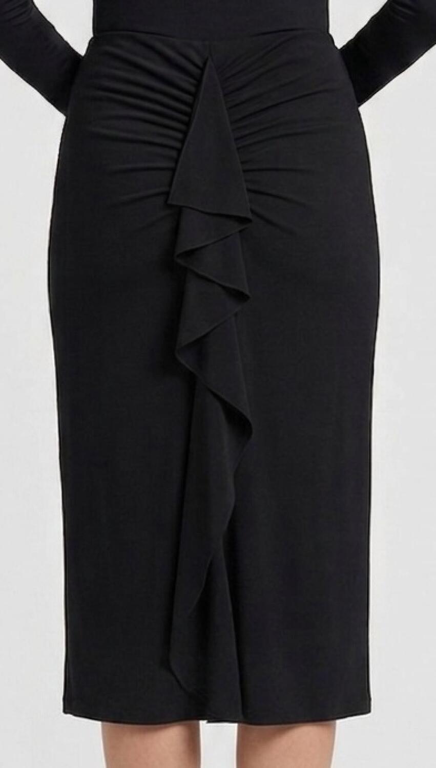 SIMPLE LONGUETTE SKIRT FRONT AND BACK WITH CURLING AND CENTRAL RUFFLES WITH SPLIT IN THE CENTER AT THE END OF THE RUFFLES