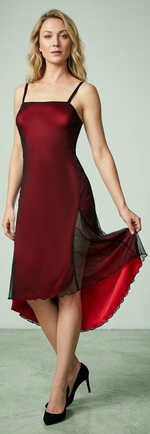 TAILORED SUIT PERFORMED EXCLUSIVELY FOR OUR BRAND, MADE IN EXCELLENT BRIGHT RED JERSEY UNDER AND OVER WITH DOUBLE BLACK TULLE that reveals THE COLOR ON. SENSUAL GAP IN TULLE COVERED BY ONLY ONE PART OF NECK GAMBE.SUL BEHIND THE LARGE DECK ONLY BLACK TULLE. BEAUTIFUL FIT 'BIG EFFECT OF HIGH AND ELEGANCE TO AN AMAZING PRICE DATA QUALITY' OF THE HEAD!
