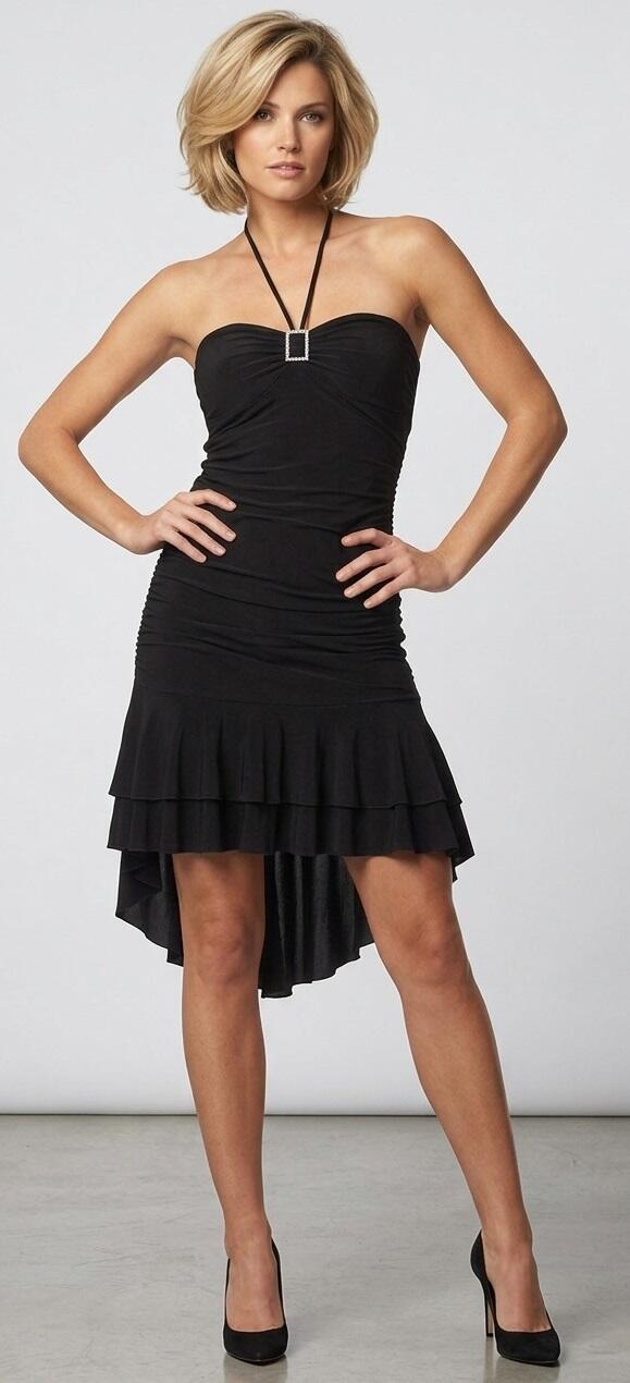 SHORT DRESS FOR DANCE IN FRONT AND MORE 'LONG BEHIND jersey ELASTIC BLACK WITH NECKLINE BAND CONNECTION BEHIND THE NECK AND CENTRAL DETAIL IN METAL WITH STRASS