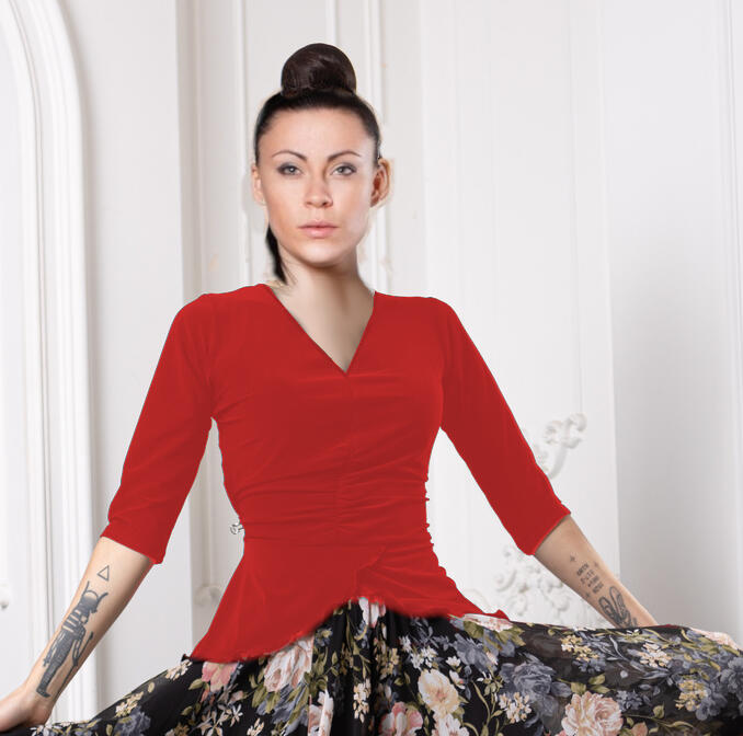 DANCE SHIRT IN STRETCH KNITTED FABRIC, A TECHNICAL FABRIC WITH THREE-QUARTER SLEEVES AND CENTER GRAIN FOR A PERFECT FIT. PANELS AT THE BOTTOM COVER THE WAIST.V-NECKLINE.KEY CLOSURE AT THE BACK OF THE NECK.