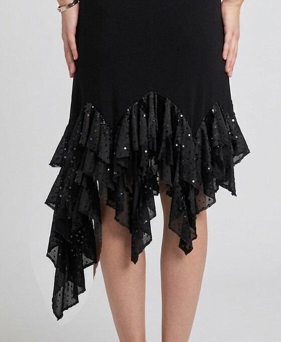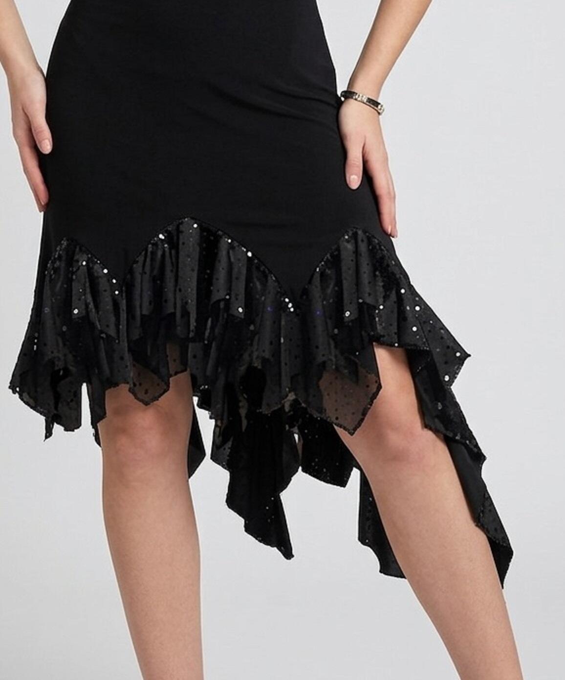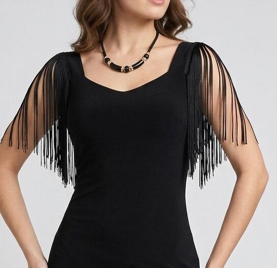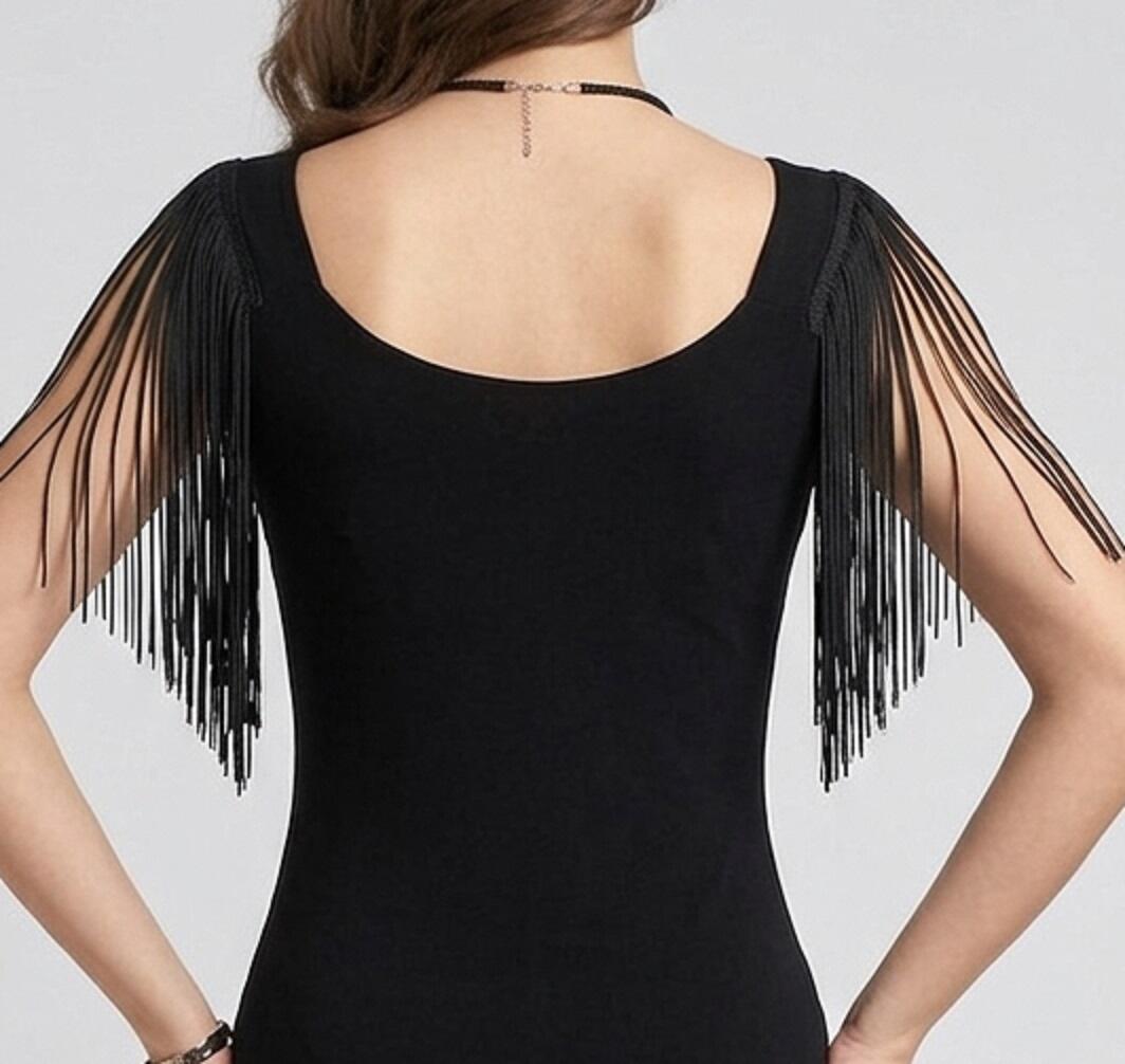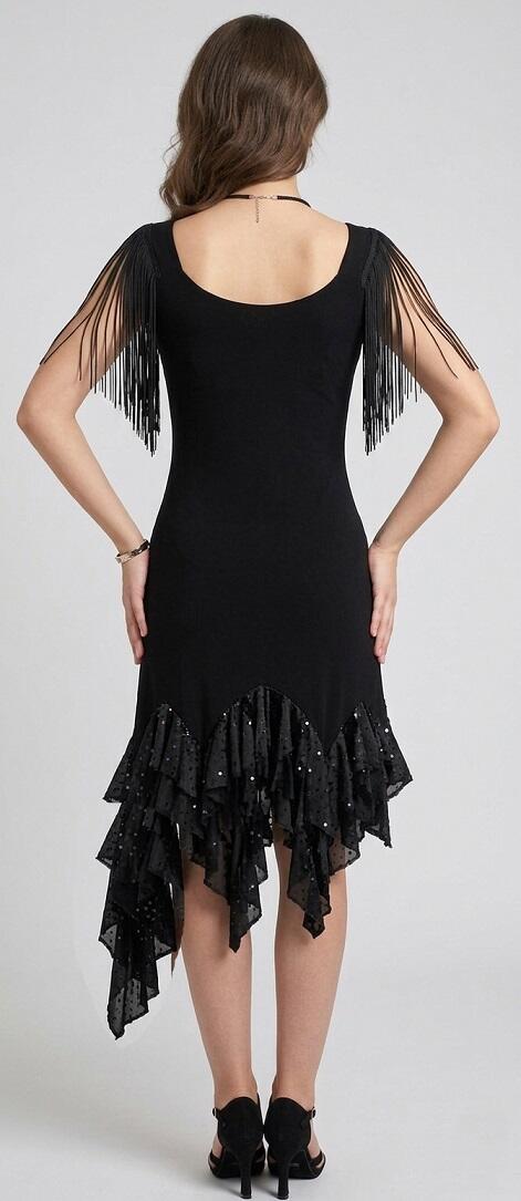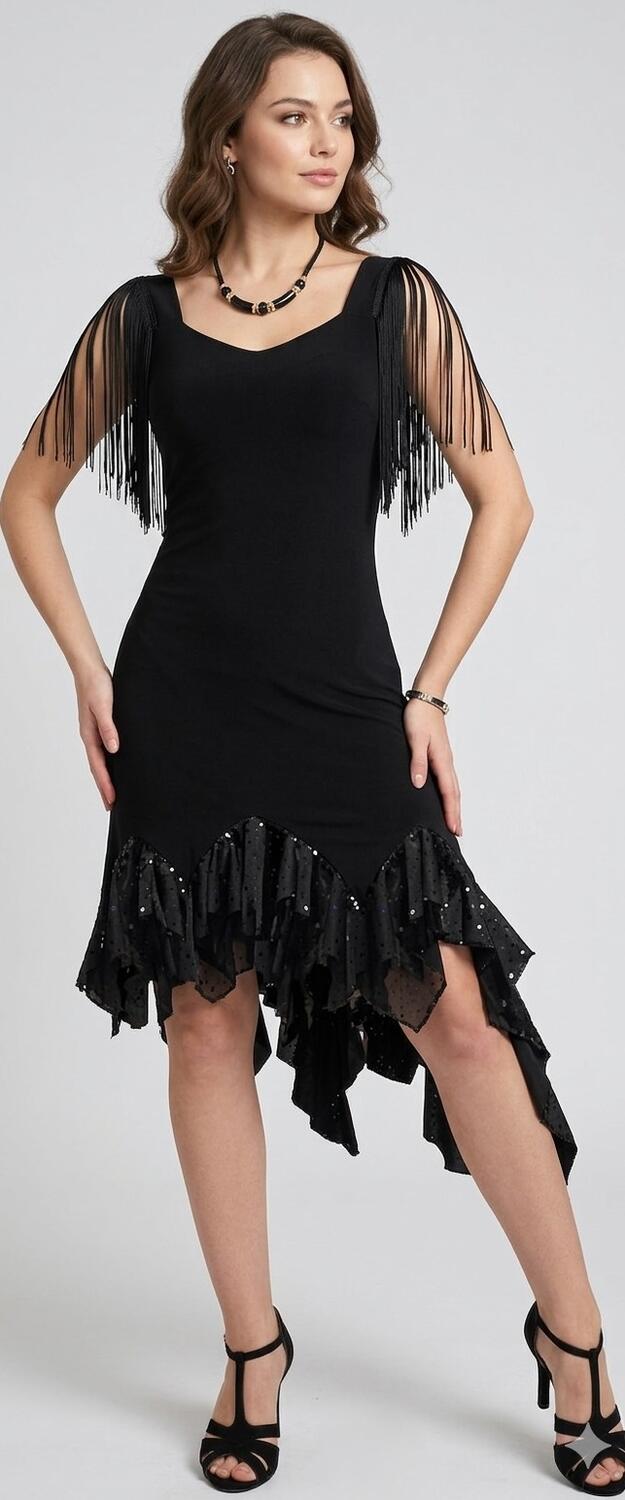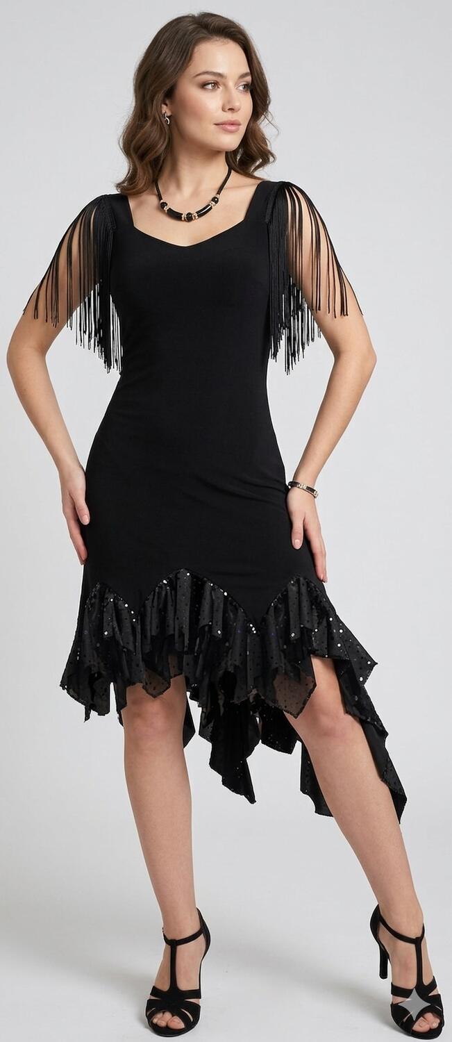 ABITO SARTORIALE ESEGUITO IN ESCLUSIVA PER IL NOSTRO MARCHIO,IN MAGLINA BIELASTICA NERA,CON RUCHES SUL FINALE IN TULLE MORBIDO NERO CON PAILLETTES PRESSATE E STAMPATE,CHE DANNO LUCENTEZZA AL TULLE E RIFLESSI ALL'ABITO. VERSIONE CON FRANGE DA 30 cm. NEL PUNTO MANICHE . MODELLO CORTO