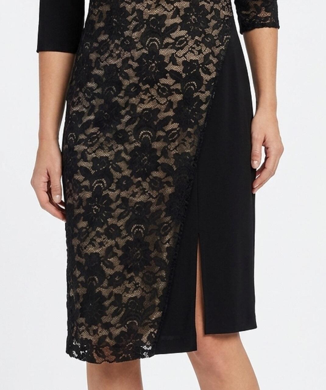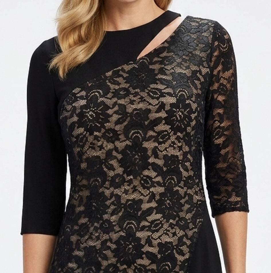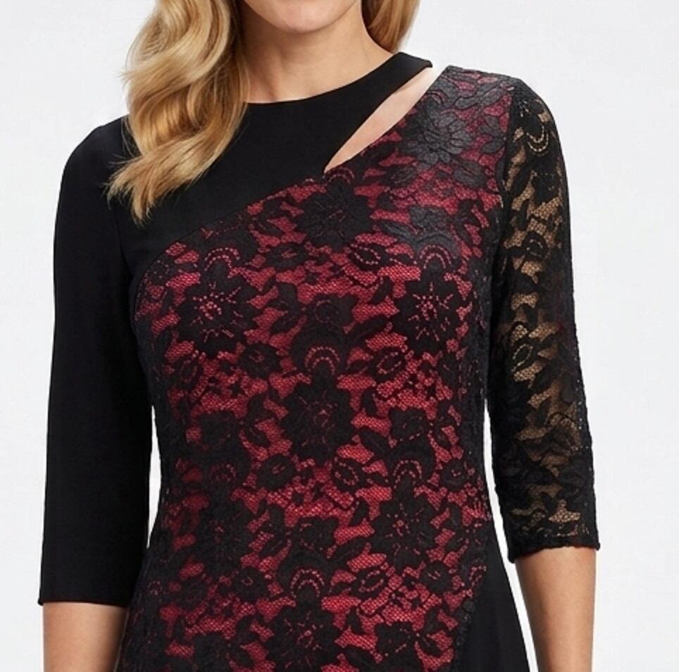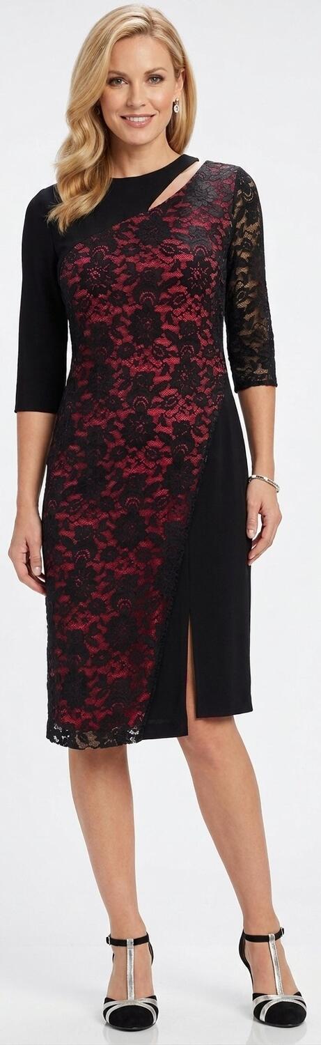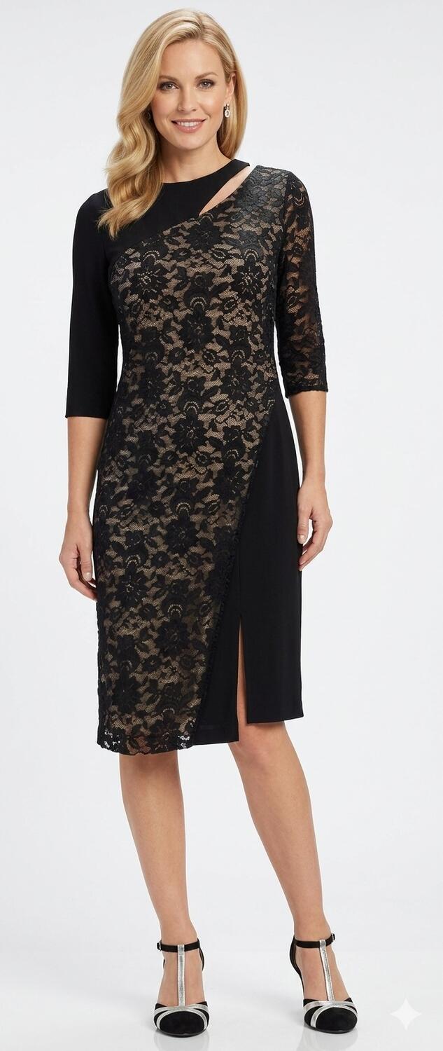 ABITO A TUBINO SARTORIALE REALIZZATO IN MAGLINA TECNICA NERA ELASTICA,CON PIZZO NERO DI ALTA QUALITA' SEMPRE ELASTICO, NELLA PARTE CENTRALE DAVANTI, FODERATO SOTTO IN CONTRASTO CON MAGLINA ROSSA OPPURE BEIGE NUDE LOOK , LA PARTE DEL PIZZO SORMONTA IL TUBINO SOTTOSTANTE CHE PERMETTE IL MOVIMENTO DELLE GAMBE.MANICHETTE A 3/4 DIFFERENTI L'UNA DALL'ALTRA,UNA IN MAGLINA E L'ALTRA IN PIZZO NON FODERATO,PARTICOLARE DESIGN DELLO SCOLLO MOLTO ORIGINALE A MEZZALUNA CHE LASCIA SCOPERTA UNA PICCOLA PARTE DEL COLLO.POSTERIORE TUTTO IN MAGLINA NERA. SPACCHETTO LATERALE PER PERMETTERE IL MOVIMENTO DELLE GAMBE DURANTE IL BALLO. ABITO MOLTO ELEGANTE.