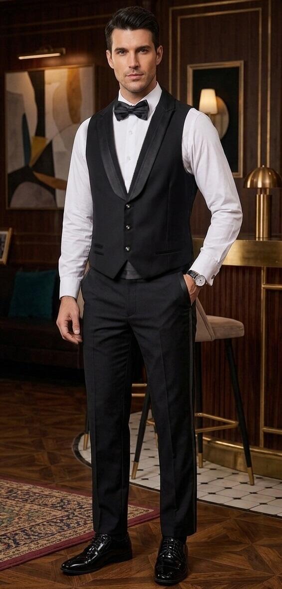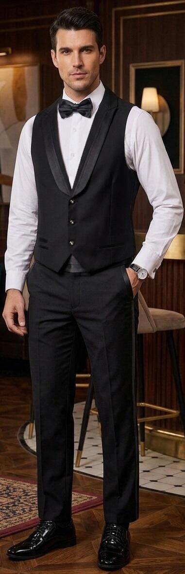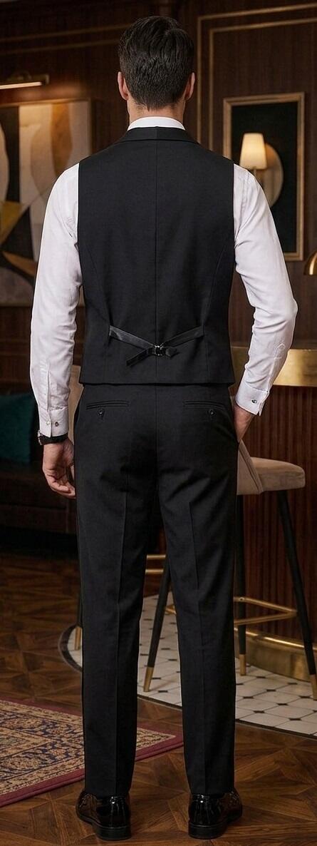 Gilet da Uomo per il Ballo e da sera versione 3 bottoni (vestibilita')SLIM colore Nero foderato scollo in stile smoking con 3 bottoni con 1 piccolo strass centrale e 3 taschini .fibbia in metallo e schiena in tessuto liscio (NON IN RASO) tinta unita .inserto con striscia verticale in raso nel colletto .Gilet con Effetto giacca di grande eleganza anche indossato solo con la camicia o sopra una maglietta e naturalmente anche sotto una giacca.