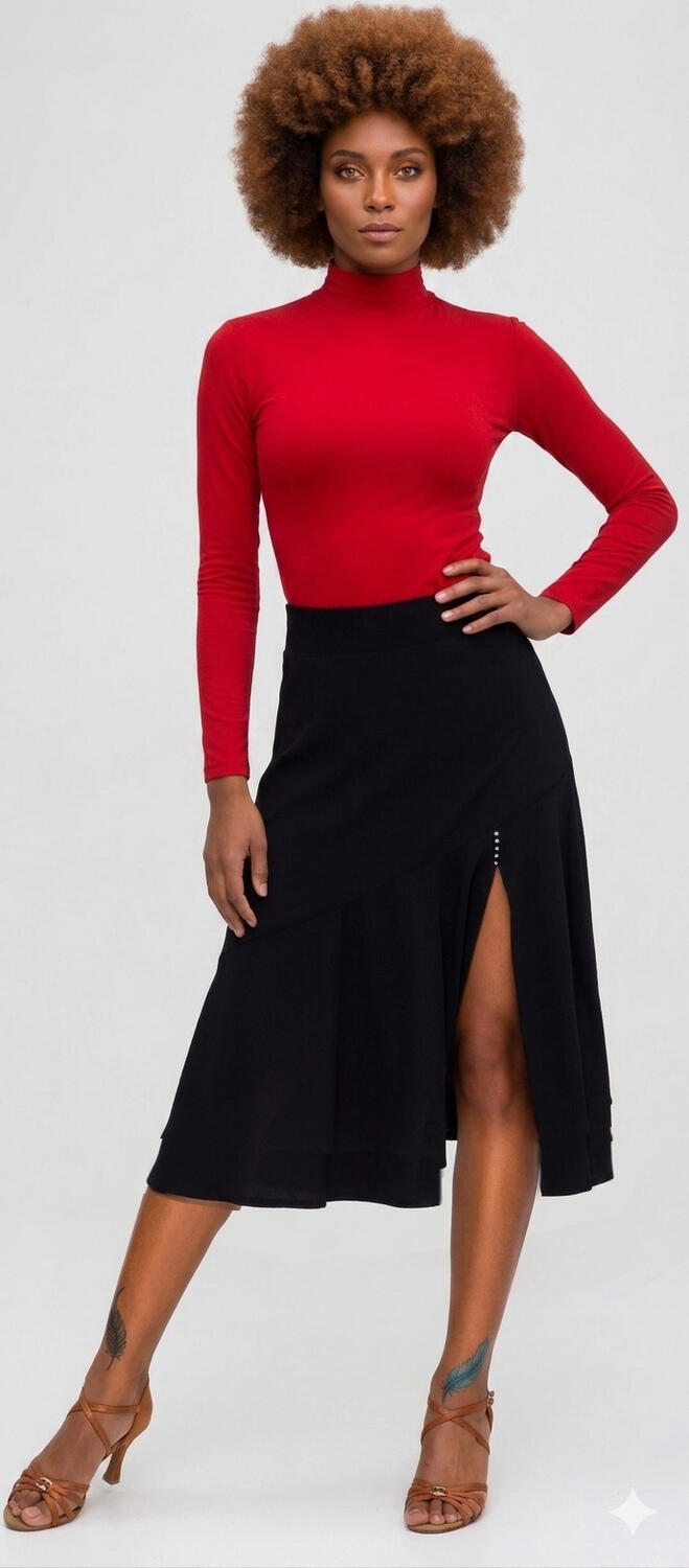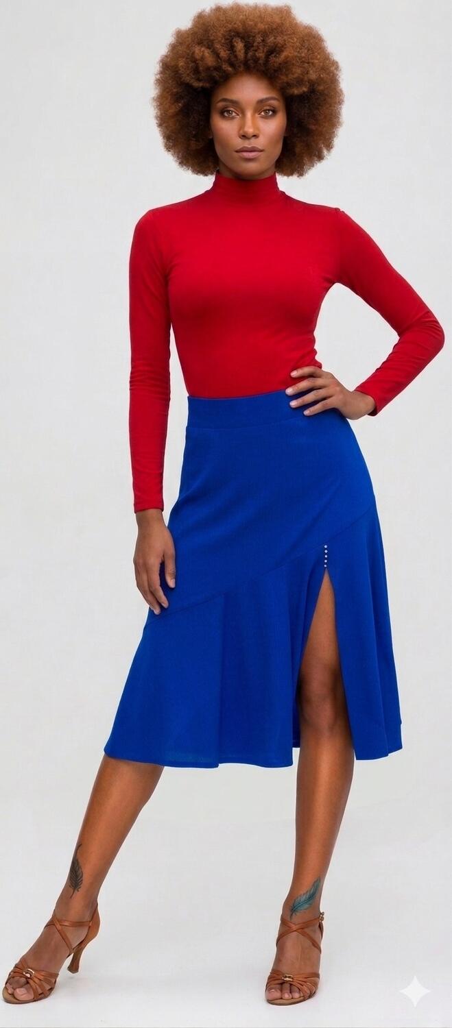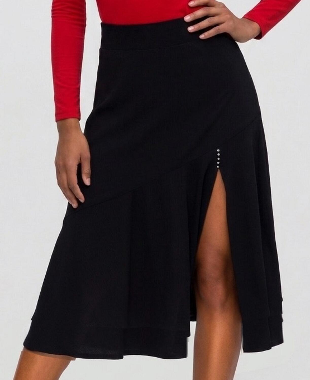 GONNA A SEMIRIOTA FINALE DA BALLO LUNGHEZZA 81 cm. IN MAGLINA ELASTICA A REALIZZATA CON DOPPIO PANNELLO FINALE SPACCO SUL LATO DESTRO E STRASS NEL PUNTO DI CUCITURA