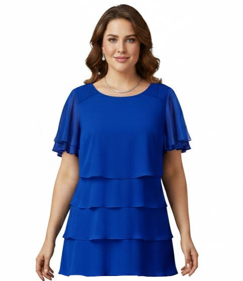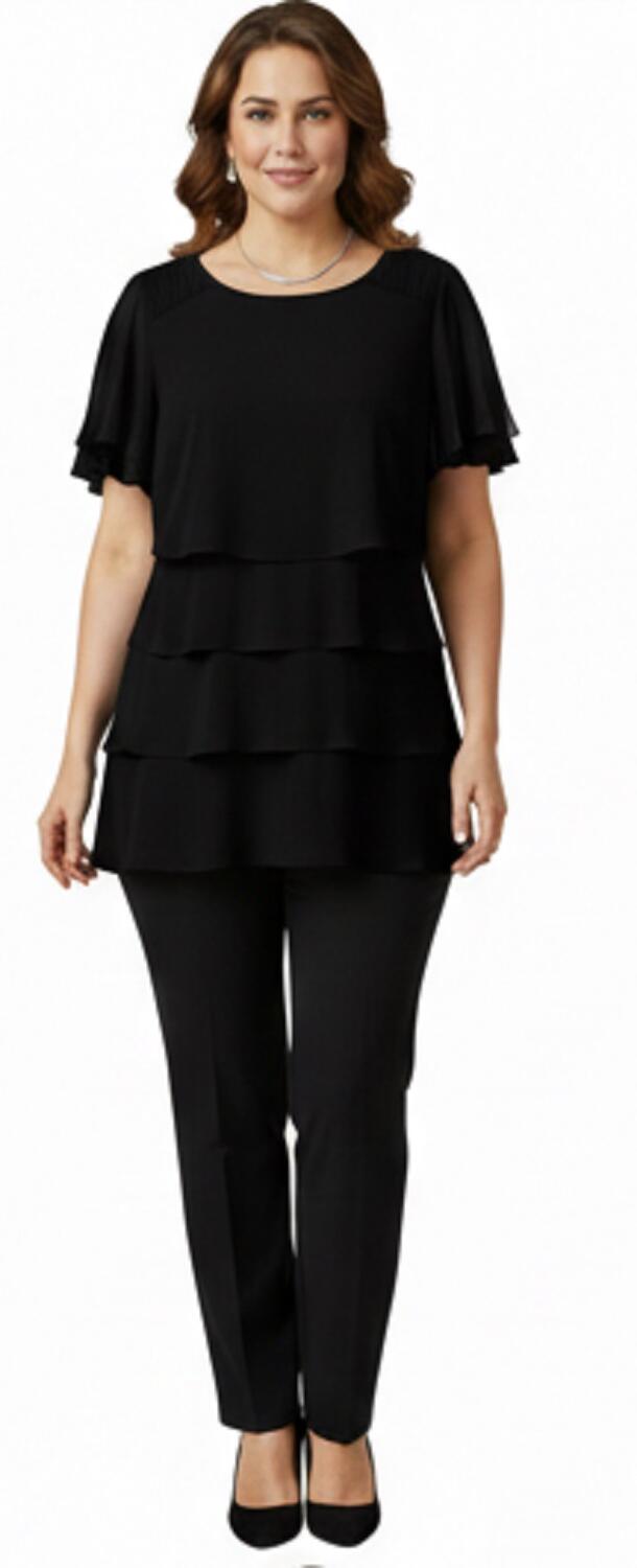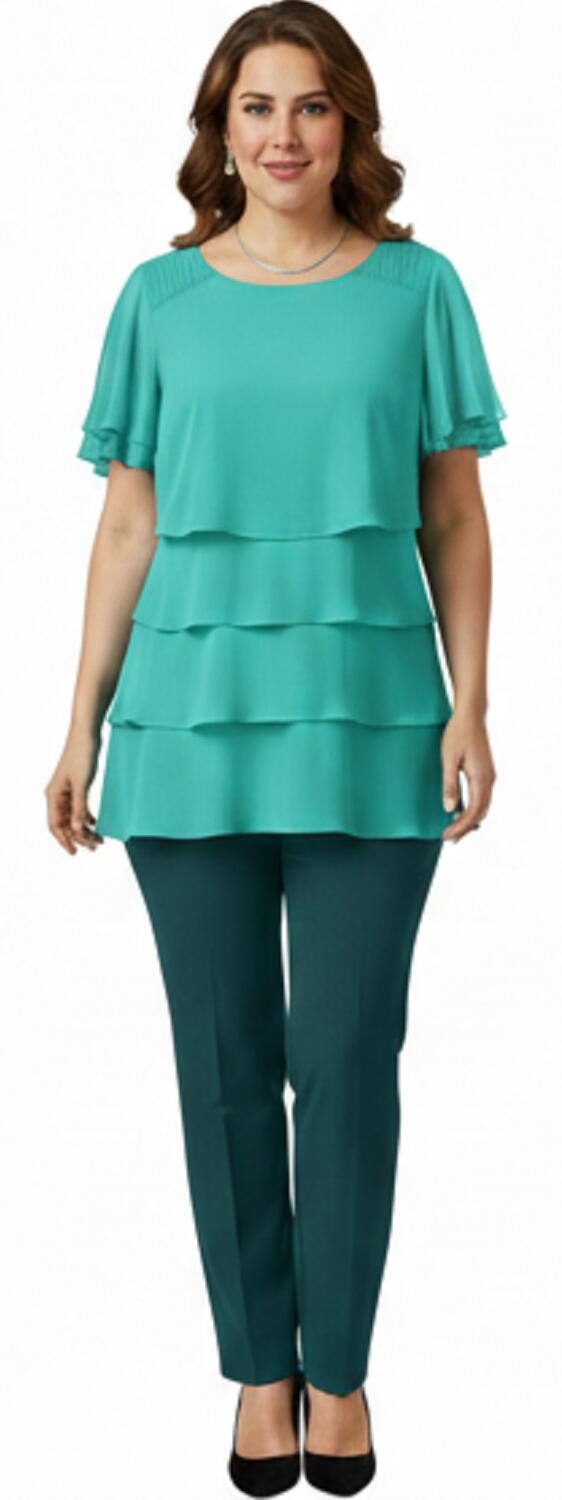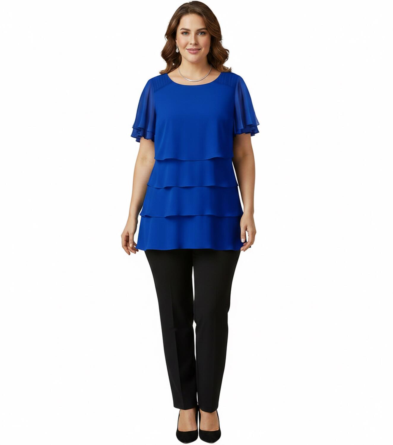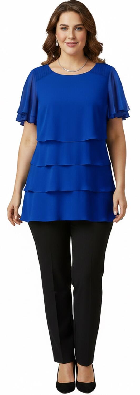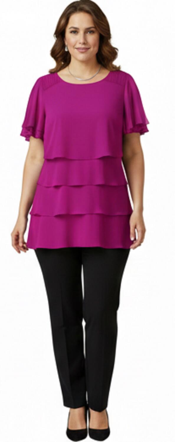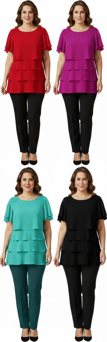 Maglia della linea taglie comode in maglina tecnica elastica di base con 4 file di balze cucite sovrapposte sempre in maglina , con manichette corte doppie e leggera arricciatura nelle spalle.schiena coperta come il davanti. Genere di maglietta che evita di segnare il fisico coprendo comodamente le forme del punto vita , perfetta indossata con pantaloni ma anche con la gonna. LA LUNGHEZZA A 4 BALZE DI CIRCA 48 cm. E' ESPRESSAMENTE PENSATA PER COPRIRE IL PUNTO VITA E PUNTO FIANCHI